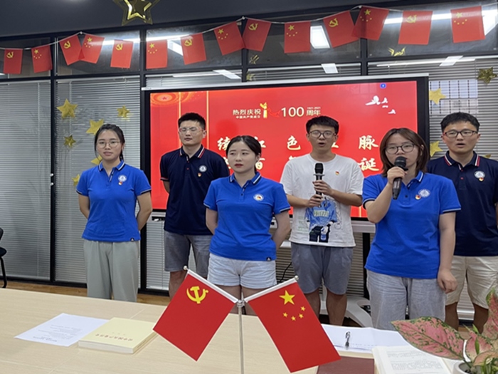 随后,学生党员代表带来小合唱《咉山红》,优美的旋律、深情的演绎,表达了革命先烈的崇敬之情。教师代表带来的诗朗诵《青春中国》,带领大家回顾了一代又一代中国青年接续奋斗,用青春之我创造青春之中国、青春之民族的百年奋斗史,铿锵有力的诵读将全场气氛推向高潮。