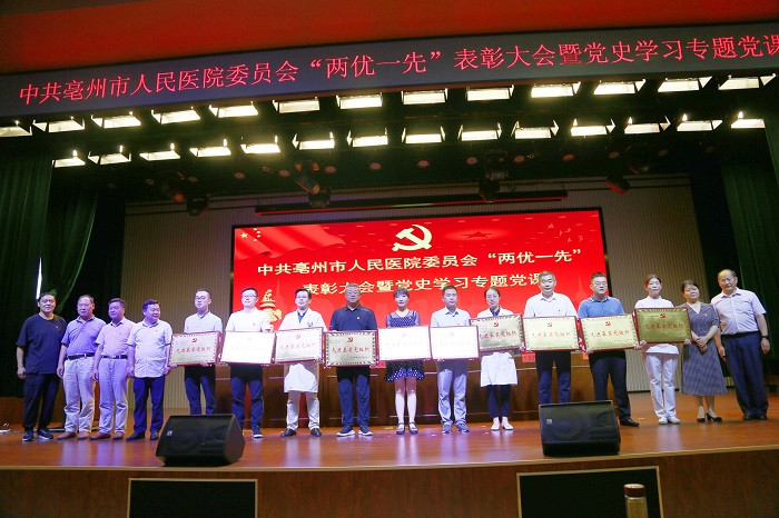 7月7日下午,附属亳州医院在行政楼学术报告厅召开“两优一先”表彰大会暨党史学习专题党课,以表彰先进、弘扬正气,激励全院广大党员不忘初心、牢记使命,以更加饱满的热情、更加务实的作风投入工作,庆祝中国共产党成立100周年。