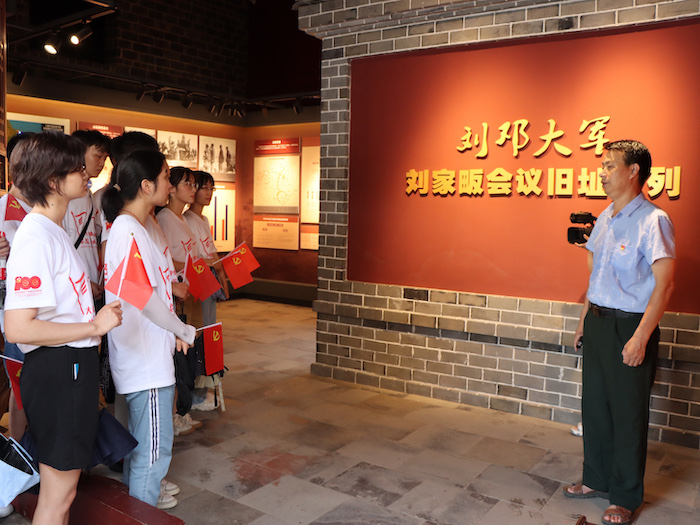 瞻仰红色基地,坚定理想信念。“1947年11月9日至12日,刘邓大军在太湖县刘家畈召开会议,这是从挺进大别山战略链中承上启下的会议,在党史、军史上具有重要意义。”在太湖县刘畈乡副乡长洪尚文、党委组织员唐奇等人的陪同下,实践队员们来到刘邓大军高干会议旧址瞻仰学习,认真聆听讲解员讲述刘邓大军在大别山艰苦奋斗的革命故事。旧址内的展陈分为“千里跃进大别山”、“决策刘家畈”、“从刘家畈走向胜利”、“军民鱼水情”四个单元,生动再现了那段烽火连天的革命历史。一件件珍贵的革命文物、一张张感人的历史照片,深深吸引着实践队员们驻足观看,让队员们近距离感受到党的英明领导以及革命胜利的艰辛历程。