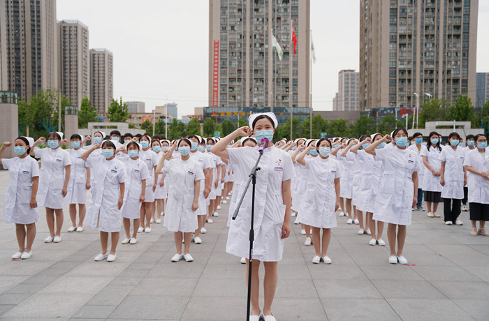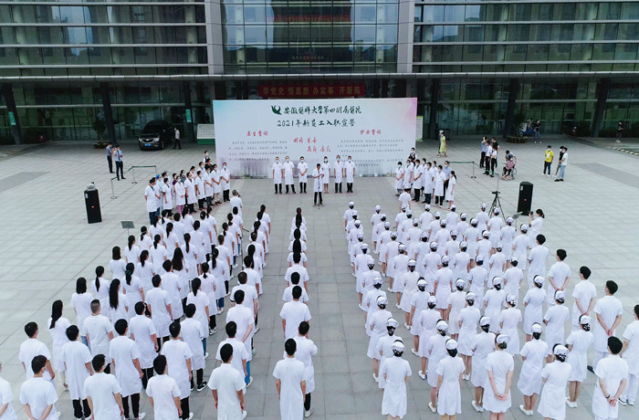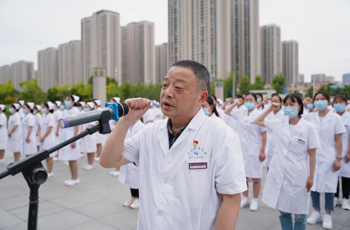 该院新入职医护人员分别在安徽省教科文卫体系统医德先进个人、该院创面修复与整形美容科主任方林森和全国抗击新冠肺炎疫情先进个人、该院EICU护士长沈杭的带领下庄严的许下了敬佑生命、救死扶伤,为人类健康事业而不懈努力的铮铮誓言。