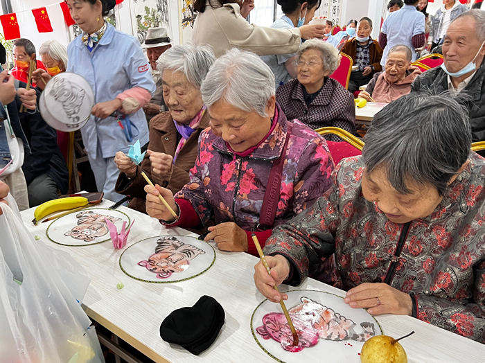护理院活动室内,该院师生为近50位老人表演了红歌合唱、诗歌朗诵和乐器演奏等精彩的节目,送去亲手制作的千纸鹤,并与老人们一同在圆扇上作画,现场其乐融融。交流互动中,师生得知现场一位名叫张瑞东的老人是安医大1966届的校友,便与老人亲切交流起现在在安医大的学习生活。张老向同学们动情描述起55年前在安医求学的经历,并激动地说:“看到你们青春的面容,像极了当年自己奋斗的模样,作为青年学生要紧跟党走,不忘初心,永远做健康的保卫者!”现场学子纷纷表示,会牢记前辈嘱托,传承安医精神,做新时代的好青年。