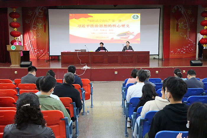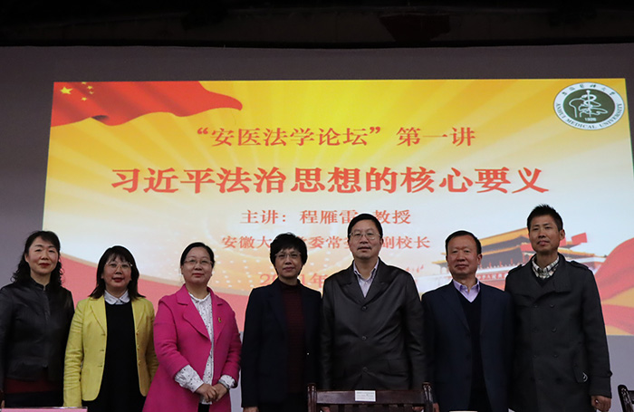 11月16日下午,习近平法治思想正式提出一周年之际,我校“安医法学论坛”开坛首讲在南校区怀远楼四楼多功能厅举行。教育部高校法学类专业教学指导委员会委员,安徽大学党委常委、副校长程雁雷教授受邀担任主讲人。校党委副书记刘群英出席论坛并致辞。