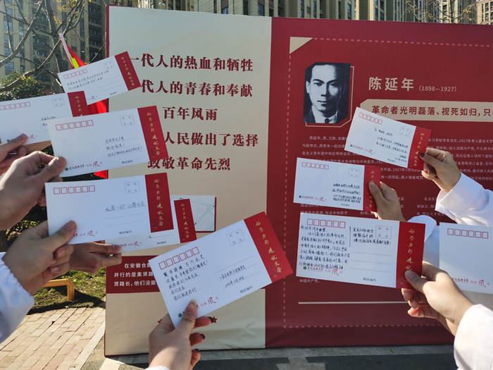 位于经开区繁华大道的延乔路,因今年热播的革命历史题材电视剧《觉醒年代》成为合肥市的代表性路标。该院学子来到此处,面对鲜艳的党旗庄严宣誓,重温入党誓词,再次明确了共产党员的责任与义务,深刻认识到自身肩负的历史使命和担当。“你们走后,我们就是你们。”“私者一时,公者千古。”“且看将来的寰球,必然是赤旗的世界!”……每一封明信片、每一朵鲜花都承载着新时代新青年们对陈延年、陈乔年两位烈士的敬意。同学们别出心裁地选用了印有校训的明信片,好学力行,立志做有本领、有担当的时代良医。