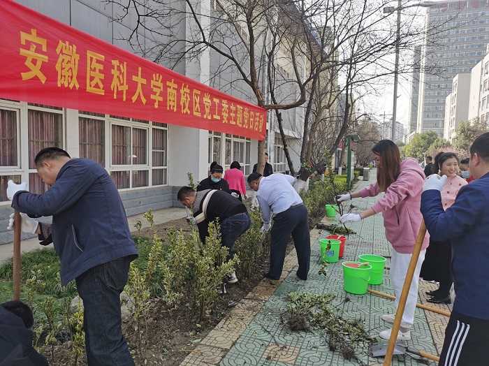 植树现场,全体人员挥锹培土、提水浇苗,一派繁忙的劳动景象。据统计,栽下金边黄杨和红叶石楠1100余株,为南校区的春天增添了一片生机。近年来,南校区管委会在改善校园绿化环境上做实做细,安排有关部门分时段分步骤对校园草坪进行改造铺设,力争两到三年内校园环境达到质的改变。同时,要求物业公司及时清除绿地中的杂草及垃圾,定期对花草树木进行修剪,切实养护好现有的校园绿植;倡导全体师生爱护珍惜校园一草一木,共同维护好校区美丽的学习生活环境。