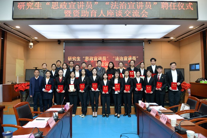 4月1日下午,研究生“思政宣讲员”“法治宣讲员”聘任仪式暨资助育人工作座谈会在知行楼一楼会议室召开。校党委副书记刘群英出席会议并讲话。