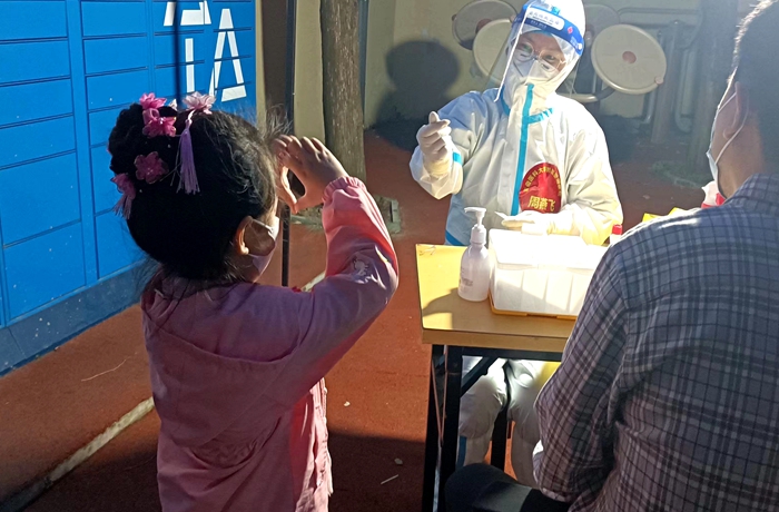“来,小朋友,嘴巴张大。啊——,不要害怕。”在上海营口路788弄小区核酸采样点,该院全科医学科护士周燕飞在给一个小女孩采样。小女孩刚做完采样,就一边用双手给她比了个心,一边甜甜地喊着:“阿姨,爸爸说你们来自安徽巢湖,一路上很辛苦,谢谢你们!”望着眼前这个粉粉的小女孩,听着稚嫩却富有真情的话语,周燕飞的内心瞬间觉得无比温暖。