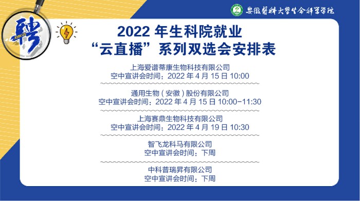 近日,生命科学学院2022届毕业生朱粮饱通过“云上录用”的方式,和安徽智飞龙科马生物制药有限公司顺利签约。受疫情影响,毕业生们外出面试受阻,该院拓宽思路、因地制宜,用一场场“云宣讲”“云招聘”为毕业生解决燃眉之急。