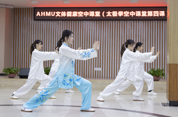 为进一步丰富封闭式管理期间校园文化生活,促进同学身心健康,学校邀请校内外专兼职教师、附属医院医生和太极拳社团的同学,通过“安医大青年之声”视频号直播平台,开设了“AHMU文体健康空中讲堂”1.0系列。空中课堂在线直播13次,内容涵盖了歌唱、舞蹈、民乐、太极拳、摄影、医疗保健等,累计观看总人数达到4327人,总点赞数达126067次。制作短视频《封闭校园里的运动范儿》《抗疫手势舞》《太极拳》等,鼓励同学们在结束了一天网课后走出宿舍,走到操场,让身体动起来,构建出一道青春飞扬的风景线。