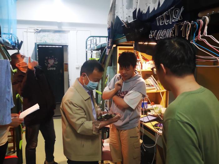何成森一行深入该院18间学生宿舍,仔细排查安全隐患,并详细询问同学们的学习、就业及生活情况,了解思想动态,耐心解答问题。结合具体的安全警示事例,何成森叮嘱同学们,要严格遵守学校学生管理和公寓管理的相关规定,严禁使用违规违禁物品,增强安全意识,切实保护好自己的人身财产安全;要注意保持个人卫生及宿舍内整洁,营造更加安全健康良好的学习生活环境。