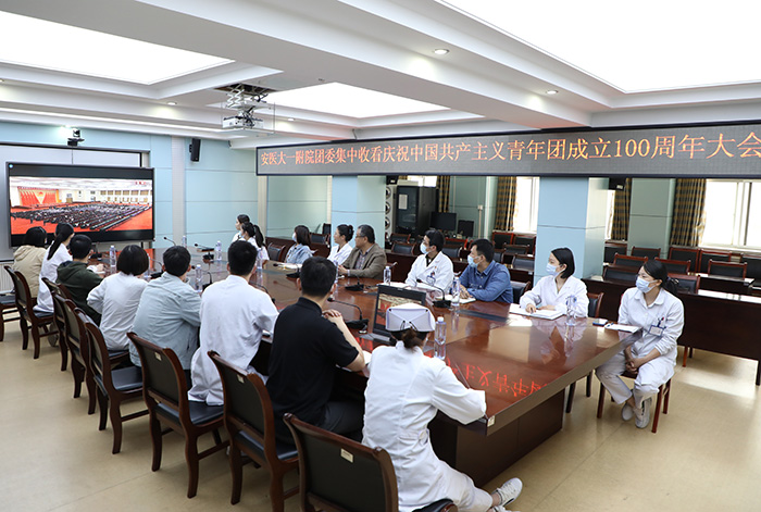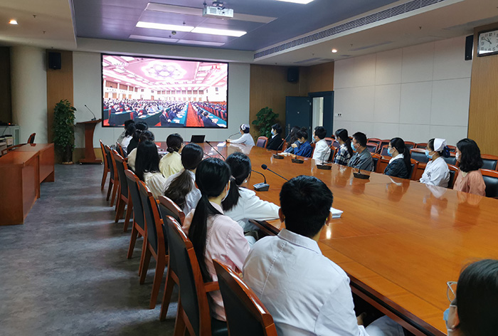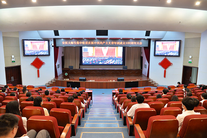 5月10日上午10时, 庆祝中国共产主义青年团成立100周年大会在北京人民大会堂隆重举行。我校师生医护员工分别在报告厅、会议室、教室、实验室、宿舍等地收听收看大会直播。