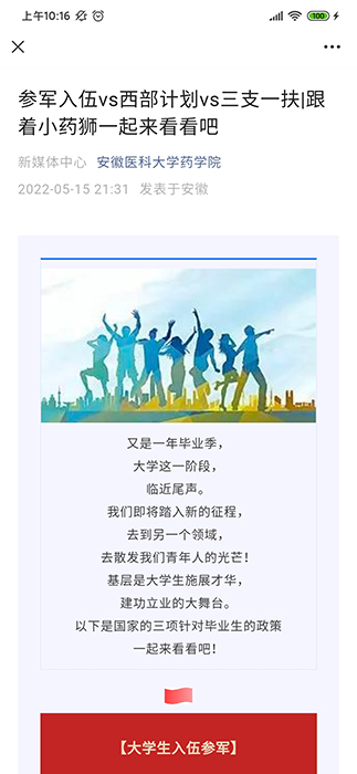 齐心协力促进步,就业指导不断档。该院组织院领导、教研室主任、毕业班辅导员与未就业学生结队,建立帮扶QQ群、微信群,积极进行就业政策宣传、就业观念引导、就业信息推介等,群策群力帮助学生解决就业过程中面临的困难和问题;邀请相关专业教师,针对毕业生考录医院和事业单位笔试环节,开展线上指导,进一步提升毕业生就业竞争力。同时,持续在毕业生中开展征兵宣传教育,通过微信公众号进行参军入伍、西部计划、“三支一扶”等基层项目的政策宣传,并走进学生宿舍加大宣传力度和广度,鼓励毕业生到祖国最需要的地方建功立业。