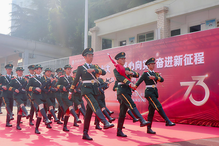 该院新生辅导员、校“优秀教育工作者”余劲松说:“站在国旗下,伴随祖国成长的记忆画面一幕幕闪过。祖国就像一个大家庭,有磨难考验,也有团结荣光!国庆的清晨,我和我的学生们一起共庆新中国成立73周年华诞,满满都是幸福的仪式感。我将用我的智慧和汗水告白祖国,为培育具有医者仁心和家国情怀的医学生贡献全部力量。”