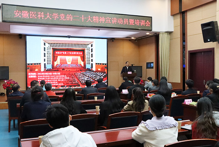 谢瑞瑾强调,学习宣传贯彻党的二十大精神是当前和今后一个时期的首要政治任务,也是学校加快建设国内一流高水平医科大学的必然要求。他要求,全校上下要把学习宣传贯彻党的二十大精神作为贯穿各项工作的核心主题,聚焦党的二十大报告和党章作出的一系列新规定新要求,努力在学懂弄通做实上狠下功夫,通过扎实系统的学习做到融会贯通、掌握精髓。要认真做好党的二十大精神的宣讲工作,教育引导全校师生医护员工衷心拥护“两个确立”、忠诚践行“两个维护”,奋进新征程、建功新时代。要强化党的二十大精神宣讲工作的组织保障,把学习宣传贯彻党的二十大精神摆在全局工作重中之重的位置,确保宣讲工作顺利开展、取得实效,推动学校事业更高质量发展。