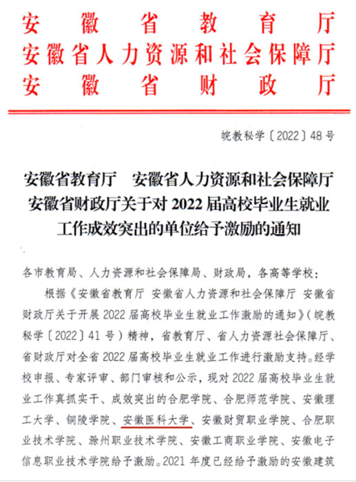 近日,安徽省教育厅、省人力资源和社会保障厅、省财政厅联合印发《关于对2022届高校毕业生就业工作成效突出的单位给予激励的通知》,表彰2022年度普通高校毕业生就业真抓实干、工作成效突出单位。我校在全省100多所高校中脱颖而出,获此殊荣。