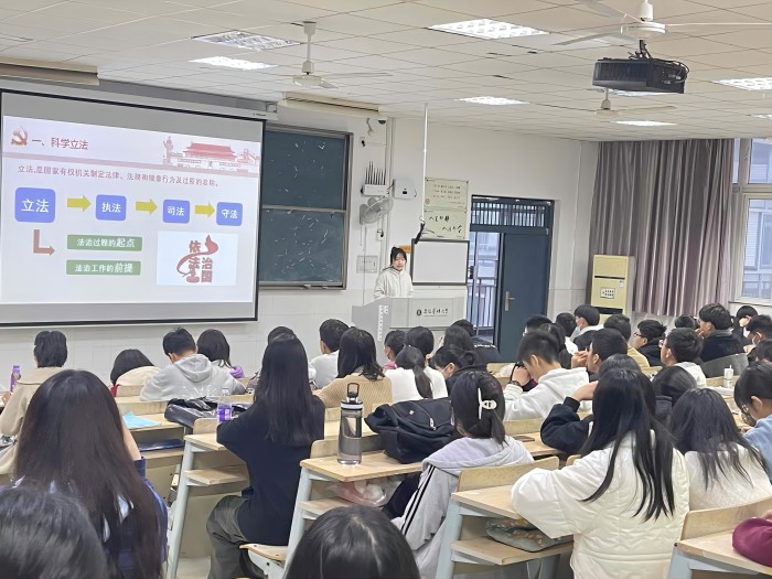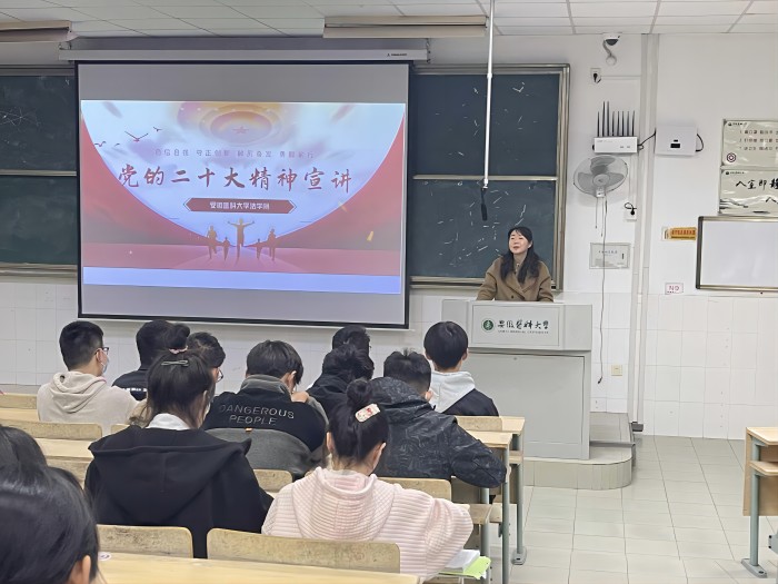 宣讲中,该院学生宣讲团成员陶颖、吴蒙、陈子健等三位同学,围绕党的二十大精神的核心要义及内涵,紧扣党的二十大报告中“坚持全面依法治国,推进法治中国建设”的法治部分内容,分别围绕“全面依法治国”“法治中国建设”及“法治轨道上发展全过程人民民主”等开展宣讲。宣讲图文并茂、深入浅出,在场同学聚精会神,边听边记,不时报以阵阵掌声。