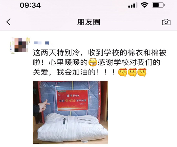 “刚下课就收到领取棉衣和棉被的短信,正值寒冬,心里特别暖,感谢学校给予我们的关怀和帮助,让我们拥有更多克服困难的勇气和底气,我一定会将学校对我们的关爱传递给更多需要的人。”2022级王同学激动地说。