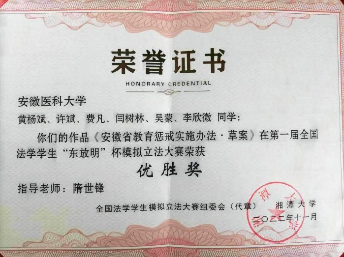 本届大赛自2022年5月启动,共有来自北京大学、中国人民大学、中国政法大学、武汉大学、华东政法大学等161所高校共计405支团队1871名本科生和研究生参赛。经过四个多月认真准备,2020级本科生黄杨斌、许斌、费凡、闫树林、吴蒙、李欣微等六位同学组成的参赛队提交的《安徽省教育惩戒实施办法·草案》这一作品,从初选阶段405份作品中脱颖而出,进入全国100强,最终在决赛中荣获优胜奖。