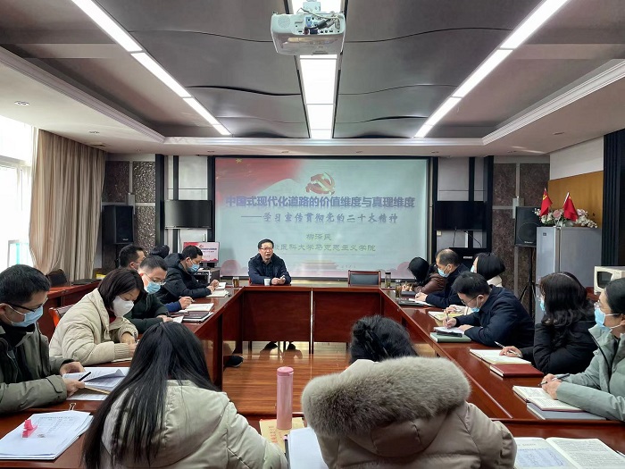 12月12日上午,人文医学学院邀请我校党的二十大精神宣讲团成员、马克思主义学院院长柳泽民教授,为学院教师作题为《中国式现代化道路的价值维度与真理维度——学习宣传贯彻党的二十大精神》的专题报告。宣讲会由该院党委书记杨秀兰主持。