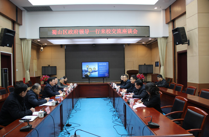 近日,合肥市蜀山区委副书记、区长杨森一行来访,校党委书记顾家山出席会议,双方就进一步深化合作展开交流。
