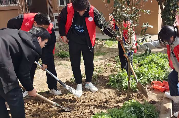 大地添新绿,植树正当时。植树节当天,该院学生前往了宝文花园、朝霞社区等多个社区,在工作人员的指引下有序开展植树栽花活动。现场热火朝天,同学们三人成团相互配合,合理分工,或拿铁锹刨坑、或手持树苗、或拿水盆浇水,共同载下青春树苗,种下未来希望。陈正李同学在活动结束后感慨道:“劳动教育是大学生成长道路上的一门必修课,应该与单纯的学生活动区别开来。我们新时代青年大学生应该更加注重劳动过程所带给我们的特殊体验,那是在理论课堂上所学不到的。”