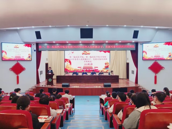 3月29日晚上,第一临床医学院、第二临床医学院分党校2023年春季入党积极分子、发展对象培训班开班典礼在校图书馆第一报告厅举行。校党委常委、组织部部长、党校常务副校长李阳新出席开班典礼并讲话。第一临床医学院、第二临床医学院领导李琮、鲍丙刚、孙民、沈慧、高晓妹出席典礼。