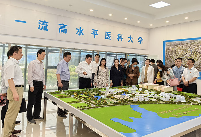 我校新医科中心(新校区)是省“十四五”教育规划高质量教育体系建设工程项目,项目一期一二批次正在全面建设,施工现场塔吊林立,主体建筑已现雏形。在代建单位省公益性项目建设管理中心的引导下,全体同志乘车参观了建设现场,感受热火朝天的建设场面。在沙盘展示区,新医科中心(新校区)建设指挥部详细介绍了项目整体规划、功能布局、景观设计、智慧系统等等,大家对眼前即将呈现打造“长三角医学教育示范区”的壮美画卷无不激动和赞叹。