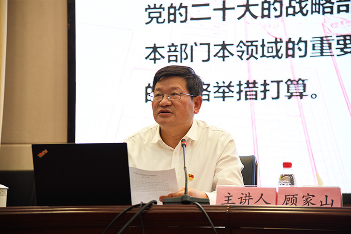 顾家山强调,学校正处于实现第一个百年奋斗目标收官和开启第二个百年奋斗新征程的关键时期,要坚持学思用贯通、知信行统一,把习近平新时代中国特色社会主义思想转化为坚定理想、锤炼党性和指导实践、推动工作的强大力量。他要求,一要加强党的领导和党的建设,衷心拥护“两个确立”、忠诚践行“两个维护”,用党的全面领导举旗定向,用党的创新理论铸魂育人,落实立德树人根本任务。二要完整、准确、全面贯彻新发展理念,加快构建新发展格局,着力提升医学教育和医疗服务保障两个供给能力,推动高质量发展。三要着力提升学校治理体系和治理能力现代化水平,高质量打造人才工作年、基础建设年、制度建设年、效能提升年。四要注重改善民生,牢固树立以人民为中心的发展思想,把师生呼声作为第一信号,把促进学生健康成长作为一切工作的出发点和落脚点。五要抓牢“关键少数”,坚持引育并举,培养造就德才兼备的高素质干部人才队伍。六要加强全面从严治党,以钉钉子精神持之以恒推进作风建设,努力办好人民满意的高等医学教育。
