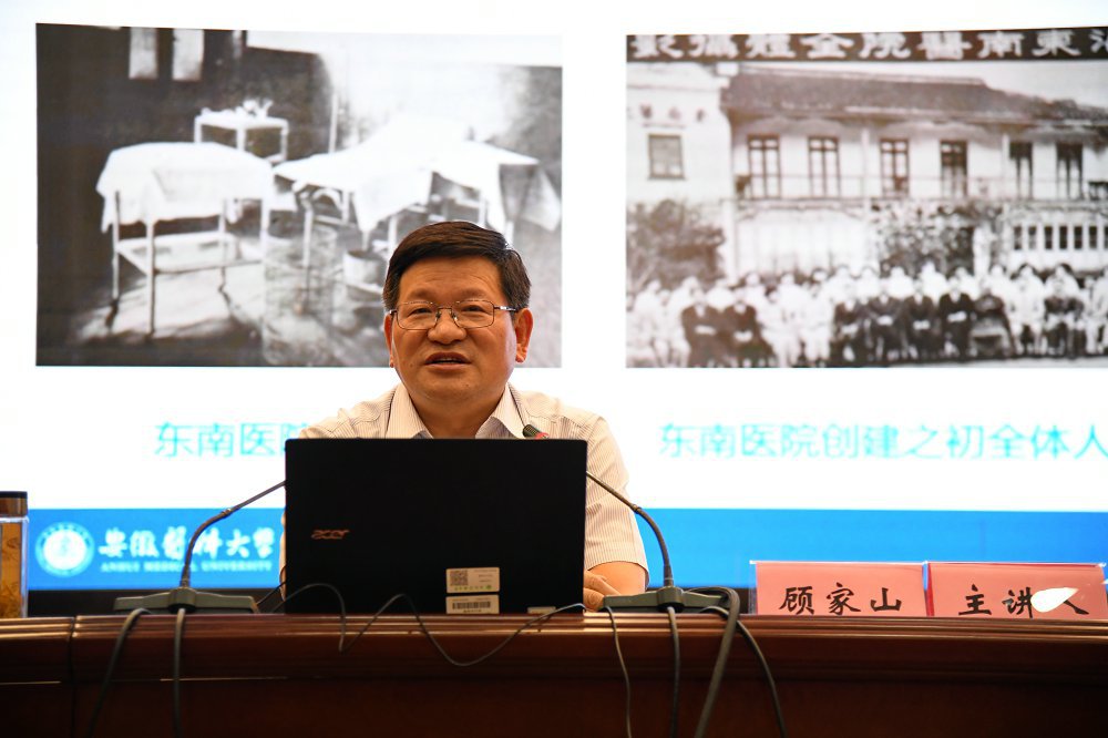 顾家山在题为《弘扬科学精神,做新时代大国良医》的报告中,回顾了安医的校史校情,顺着学校筚路蓝缕的创业脉络娓娓道来,详实地展现了老东南的珍贵史料、先辈们的奋斗历程、杰出校友的先进事迹。正在如火如荼建设中的我校新医科中心(新校区)“云台”结构的图书馆、临水而建的音乐厅、飞翔双翼的活动中心等区域,更增添了同学们对学校未来发展新图景的向往。