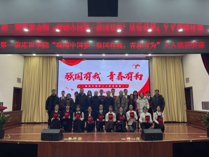 1月4日晚,第一临床医学院在图书馆第一学术报告厅举办“我的中国梦——强国有我,青春有为”人人演讲院级决赛。校党委常委、组织部部长李阳新,校党委宣传部常务副部长单永强、校党委学工部部长秦楠、校离退休教职工党委书记谢敏、马克思主义学院党委书记谢宜鹏和校团委副书记陈伟受邀担任评委,该院学生党总支书记李琮、学生党总支副书记高晓妹出席活动。