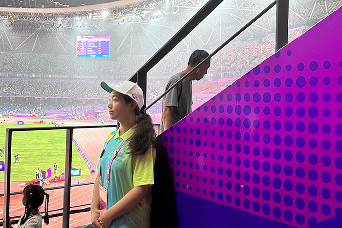 李霂梓服务的L中层距离奥体中心主体育场的主火炬很近,也是观看撑竿跳高以及百米比赛起跑的绝佳位置,所以经常有观众、媒体或是外国教练来这里观看和记录比赛。“印象较深的是女子撑竿跳高拿下银牌的选手教练,他在决赛开场前两小时就上来看选手们热身。虽然语言不通,但是他拿着翻译机礼貌地来找我询问是否可以在看台这个位置停留,并向我夸赞同场比赛的中国选手水平极高。最后下楼前,他还主动问我是否需要带一瓶水。”回忆这些经历时,李霂梓脸上一直洋溢着笑容,“这样简单友好的交谈使我真正感受到了亚运会上友谊与尊重的共存。”