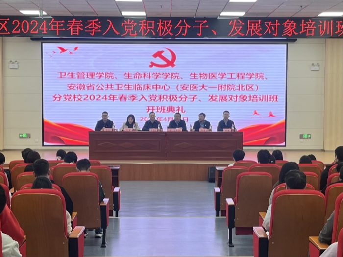 4月12日下午,卫生管理学院、生命科学学院、生物医学工程学院、安徽省公共卫生临床中心(安医大一附院北区)等四家单位分党校,在东校区联合举办2024年春季入党积极分子、发展对象培训班开班典礼。校党委组织部副部长、党校常务副校长白亮亮出席开班典礼并讲话。生命科学学院党委书记沈慧宣读关于举办本次培训班的有关通知文件,卫生管理学院党委书记赵云峰主持开班典礼。一附院北区党委副书记、副院长邓洪禹,卫生管理学院党委副书记胡鹏、生物医学工程学院党委副书记周晓伟出席。