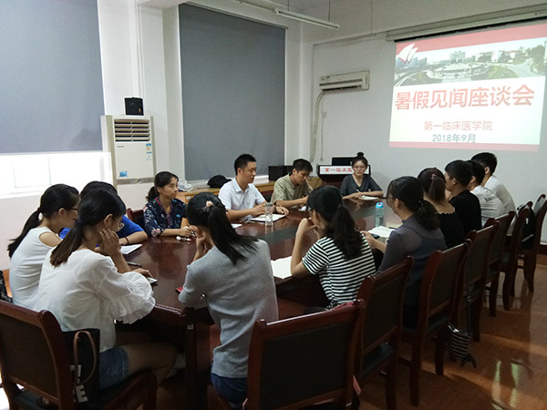 9 月 2 日上午,第一临床医学院师生在院学生党总支会议室畅谈暑期见闻,院学生党总支副书记薛磊主持座谈会。