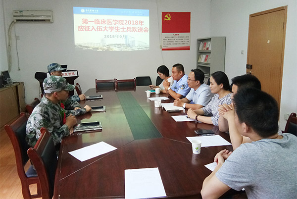 9月8日,第一临床医学院举行应征入伍大学生欢送会,欢送今年应征入伍的3名在校大学生。该院学生党总支领导、校保卫处(武装部)相关负责人、应征入伍学生辅导员及同学代表参加欢送会。
