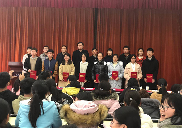 最终,评委们在对八名同学的演讲材料、语言表达等五方面的评定后,选出了一等奖两名、二等奖和三等奖各三名,由评委老师为获奖选手们颁奖并合影留念。
