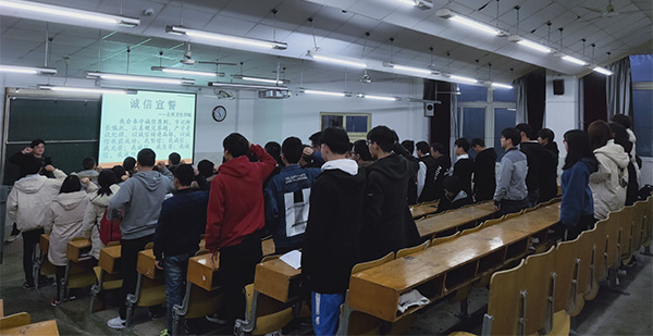 诚信考试宣誓。组织同学进行诚信考试宣誓:“我会奉守诚信原则,牢记师长嘱托,认真规范答题,严守考试纪律,以诚信铸造品格,以诚信收获成功。我坚信:我诚信,我光荣;我诚信,我自尊;我诚信,我成功。”在铿锵嘹亮的宣誓声中,同学们既接受了一份精神的洗礼,又做出了一份庄严的承诺。