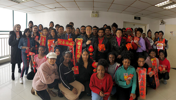 2月4日正值大年三十,国际教育学院领导和老师们一起走进尚美楼2号楼,慰问留校的国际学生们,与他们共庆中国团圆年。