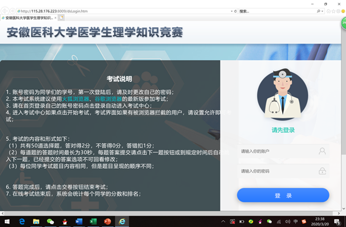 本次比赛采用创新性在线考试的方式,在疫情防控期间顺利完成了参赛学生的选拔工作。初赛采用在线考试系统进行,通过系统设置题目随机顺序、每题作答限时30秒、题目不可回看等方法,防止作弊的可能性,确保比赛的公平性。决赛以在线笔试快答和口试相结合的方式进行。在线笔试快答六人一组,题板15分钟写完10道题目后图片提交,教师通过QQ视频进行监考;口试通过QQ电话会议的方式,由基础医学院生理学教研室和病理生理学教研室7位教师组成现场评委小组,学生依次加入会议,完成1分钟的英文自我介绍,和两道随机问题的现场作答。