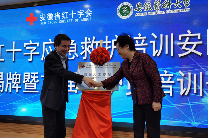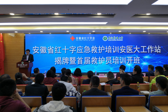 10月25日,学校举行安徽省红十字应急救护培训安医大工作站揭牌暨首届救护员培训开班仪式。省红十字会党组成员、专职副会长孙齐云、副校长吕雄文出席仪式,共同为工作站揭牌。