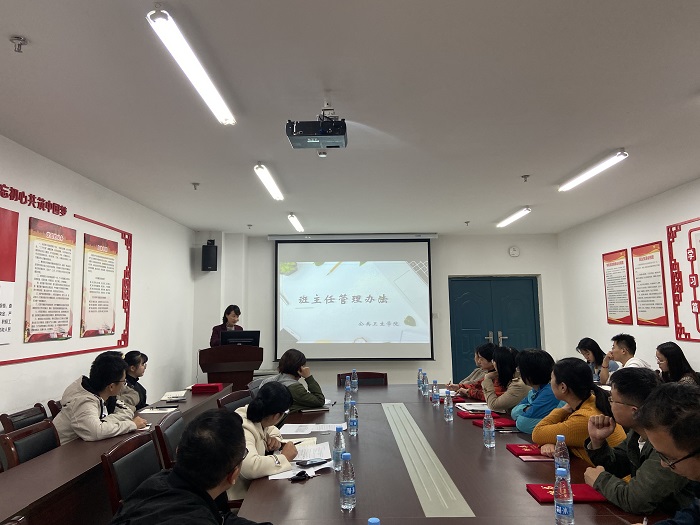会上,潘莉莉结合学校关于班主任、创新创业类、学习类社团指导教师的管理要求和班主任工作考核等文件规定,详细介绍了班主任的聘任、管理、工作职责、考核等内容。她希望新生班主任们要作学生思想上的引导者,引导大学生坚定理想信念,以时不我待、只争朝夕的精神,更好担负起时代赋予的使命;要作学生学业上的陪伴者,紧抓不懈,营造创优争先的良好学习氛围;要作学生情感上的守护者,用心用情,帮学生切实解决问题,事无巨细地做好教育管理服务工作。