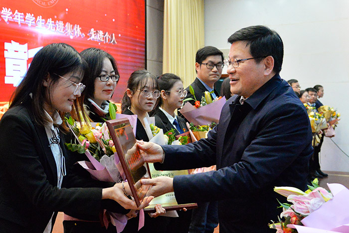全体校领导为9个批次的先进集体和先进个人颁奖。一张张证书寄托了学校的肯定与认可,一束束鲜花饱含着老师的祝愿与期盼。公共卫生学院研究生第三党支部书记万宇辉、第二附属医院团委书记黄硕、第二临床医学院2016级临床医学专业41班张海桃、第一临床医学院向善楼1号402宿舍吕智涵作为先进集体代表上台发言。