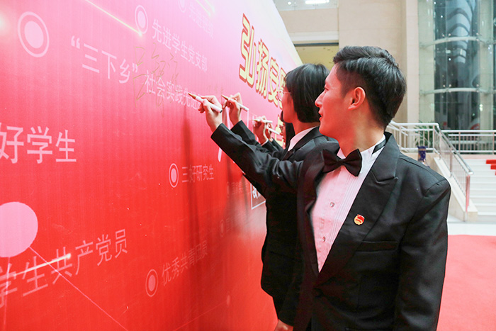 典礼开始前还举行了红毯仪式。图书馆一楼大厅内,伴随着大学生民乐团和室内乐团现场演奏地悠扬乐声,受表彰学生迈着自信从容的步伐,在同学们的热烈掌声和欢呼声中踏上学校为其精心准备的红地毯,来到签名墙前签名留念。现场气氛热烈,在场同学都更加真切地感受到榜样的力量。