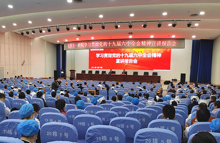 第一附属医院党委书记金宗祥在主持报告会时指出,学习宣传贯彻党的十九届六中全会精神,是当前和今后一个时期的重大政治任务。医院全体党员干部职工要以此次宣讲报告会为契机,全面深入学习,把思想和行动统一到全会精神上来,确保全会精神落地生根。他强调,党员领导干部要扛起责任、以上率下,提高政治站位抓学习,准确把握全会精神的要义。要全面覆盖抓宣传,迅速掀起学习宣传全会精神的热潮,引导广大党员干部职工切实增强衷心拥护“两个确立”、坚决做到“两个维护”的政治自觉。要深入贯彻抓落实,把学习成果转化为干事创业的能力水平和强大动力,切实把学习宣传贯彻全会精神同深入推进党史学习教育相结合,同推动落实医院“治病救人、立德树人”根本任务相结合,确保各项工作有部署、快推进、见实效,以医院高质量发展的优异成绩迎接党的二十大胜利召开。