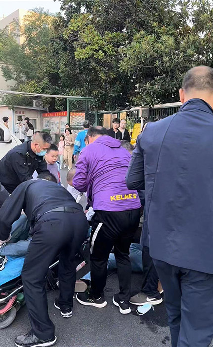 “当时情况非常紧急,倒地的人个头不是很高,还背着书包,一开始还以为是大学生,后来问旁边的孩子,才知道是学生家长。我们跑过去的时候,看到她双腿绷得很直,我把她翻过来后,看到她牙关紧闭,我们喊她也没有什么反应,于是就立刻把她嘴巴掰开,查看有无呕吐物堵住喉咙,防止窒息。另外也要防止她咬到舌头,因为当时她的嘴角已经有一些血丝了。”徐龙把患者翻过来,让她的头部靠在自己身上,避免头部再次受到伤害,曹建军就赶紧打电话联系120救护车。