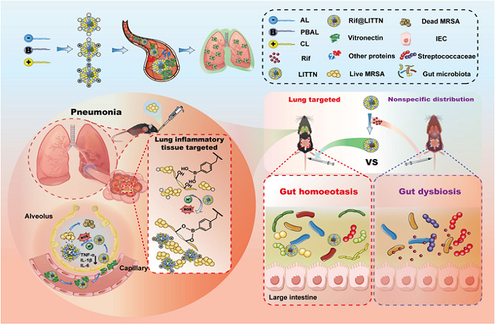 静脉注射抗生素在肺炎临床治疗中为常规方法,尤其对于严重侵袭性细菌性肺炎。然而,全身使用抗生素不仅导致包括肝肾损伤和肠道菌群失调等在内的严重副作用,且易诱导耐药菌株出现与不良的药物经济学效应。因此,如何实现抗生素的精准递送具有重要意义。
