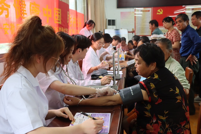 乡村振兴,健康先行。在汪满田村党群服务中心,实践队员结合医学专业知识,面向村民开展了以“服务健康中国,助力乡村振兴”为主题的健康服务。前来参加活动的村民络绎不绝,实践队员张玥、许诺热情地为他们提供血压测量、血糖检测等服务,并建立健康档案,登记村民的健康状况。“爷爷,您的血压有点偏高,要注意饮食、多锻炼,祝您生活愉快!”结合当地饮食习惯,实践队员王雪节和小伙伴们详细地向村民讲解高血压、糖尿病等常见慢性病的防治知识,提出饮食、生活作息等相关建议,并提醒血压、血糖较高的村民尽快到医院诊疗。“在家门口就能享受到贴心的健康服务,真好!”今年70多岁的汪爷爷测完血糖后满意地说道。