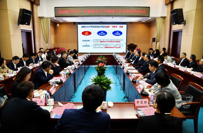 11月10日上午,温州医科大学来校调研交流,双方以共建大分子药物与规模化制备全国重点实验室合肥中心为契机,达成战略合作意向。中国工程院院士、温州医科大学校长李校堃,安徽省卫生健康委员会党组副书记邢程、省科技厅副厅长姚群、省教育厅副厅长刘业勋出席会议并讲话。校党委书记王琦主持会议,校长翁建平在会上致辞,学术副校长张智在会上作主题汇报。