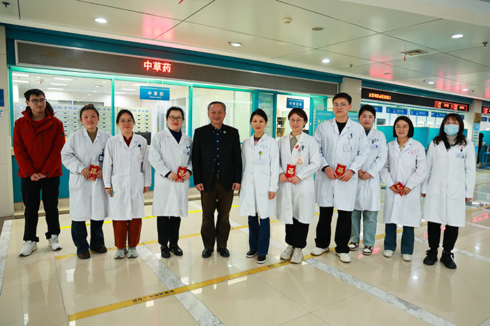 在各个直属附院,翁建平先后走访了门诊服务台、挂号窗口、药房、分诊台、诊室等区域。“感谢你们坚守岗位,护佑群众生命健康!”“祝大家新春快乐,阖家幸福,顺顺利利!”每到一处,他与医务工作者们亲切交谈,详细询问春节期间门诊就诊情况和员工工作状态,代表学校对春节期间坚守岗位、敬业奉献的广大医护职工表示感谢,并送上新春红包,表达美好祝愿。他还向前来就诊的群众表示问候,祝愿早日康复。