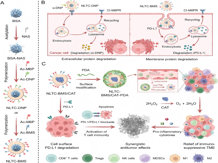 鉴于此,本文构建了一种新型LYTACs纳米平台(NLTC)。NLTC是一种具有功能表面的聚合物纳米胶囊,通过原位聚合技术在单个蛋白表面整合蛋白靶向配体、溶酶体靶向配体制备,可以有效降解特定细胞外蛋白和膜相关蛋白。区别于现有LYTACs策略,NLTC能够整合其它免疫调节功能。利用NLTC包载过氧化氢酶可以有效催化肿瘤组织内过氧化氢分解为氧气,从而缓解免疫抑制性肿瘤微环境。此外,对NLTC表面进行响应性修饰可避免NLTC在血液循环和正常组织中的非特异性激活,增强肿瘤富集和肿瘤选择性蛋白降解。动物实验结果证明,NLTC在静脉注射后能有效降解肿瘤细胞表面免疫检查点并缓解肿瘤免疫抑制性微环境,最终抑制恶性肿瘤的生长、复发和转移。