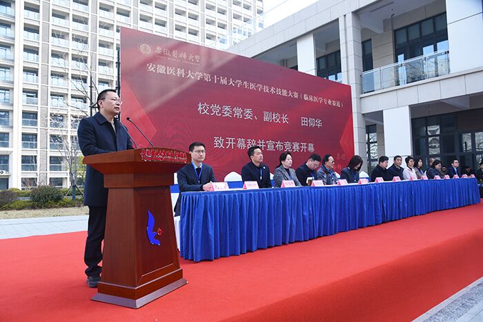 田仰华在致辞中指出,学校高度重视师生的临床技能培训工作,2014年以来,连续举办9届校级大学生临床技能竞赛,并在全国高等医学院校大学生临床技能竞赛全国总决赛、中国大学生医学技术技能大赛临床医学五年制赛道中获得多项荣誉。附属阜阳医院作为校直属附属医院,近几年来在医院建设发展上取得了长足进步,为皖北区域健康保障作出了重要贡献。本次竞赛面向学校各个实践基地开展,各路英杰汇聚一堂,必将大大提高大学生临床技能操作的规范性及运用能力。希望选手们在比赛中展现出自己的良好风采,诠释新时代医疗卫生职业精神,同时以赛促学,进一步提高技术操作规范和精准性,为未来促进整体医疗水平的提高贡献力量。
