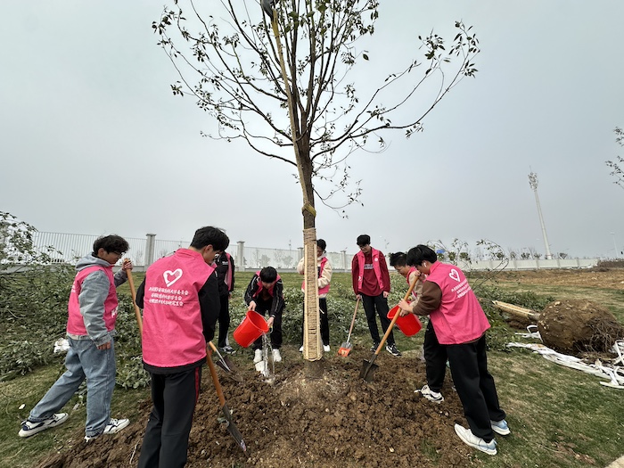 植树添新绿,共建新校园。植树活动在新校区绿化区域火热开展。同学们热情高涨,手持铁锹、水桶,积极投入植树劳动中。大家分工协作,有的挥锹铲土,挖掘树坑;有的小心翼翼地扶正树苗,确保树苗直立;有的则拎着水桶,为新栽的树苗浇水。新种下的树苗在校园里扎根生长,不仅为校园增添了一抹清新的绿色,也象征着同学们为新校区建设贡献力量的决心。